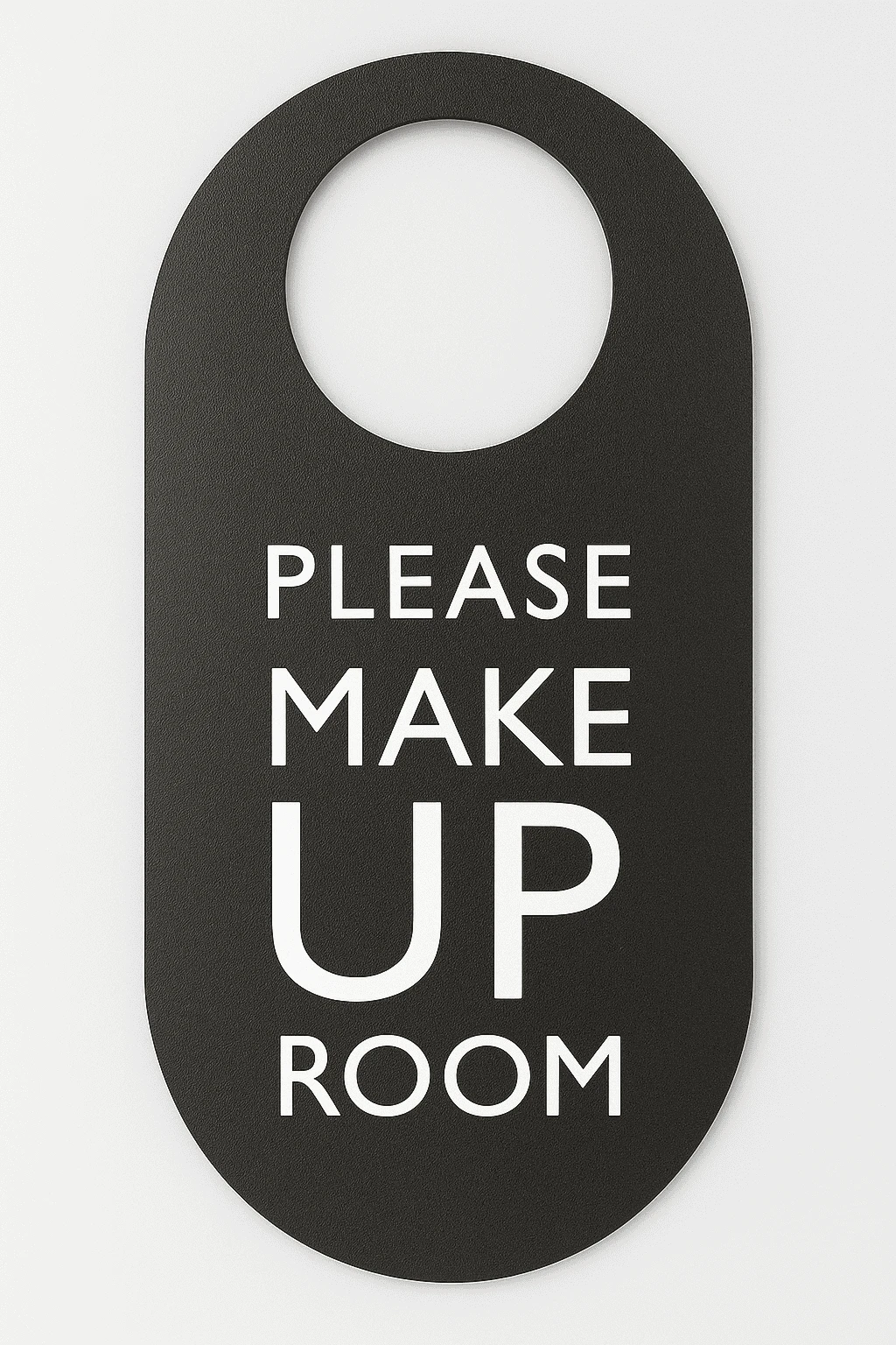 One side reads “PLEASE DO NOT DISTURB” in bold black text on a white background, while the other side reads “PLEASE MAKE UP ROOM” in white text on a black background.