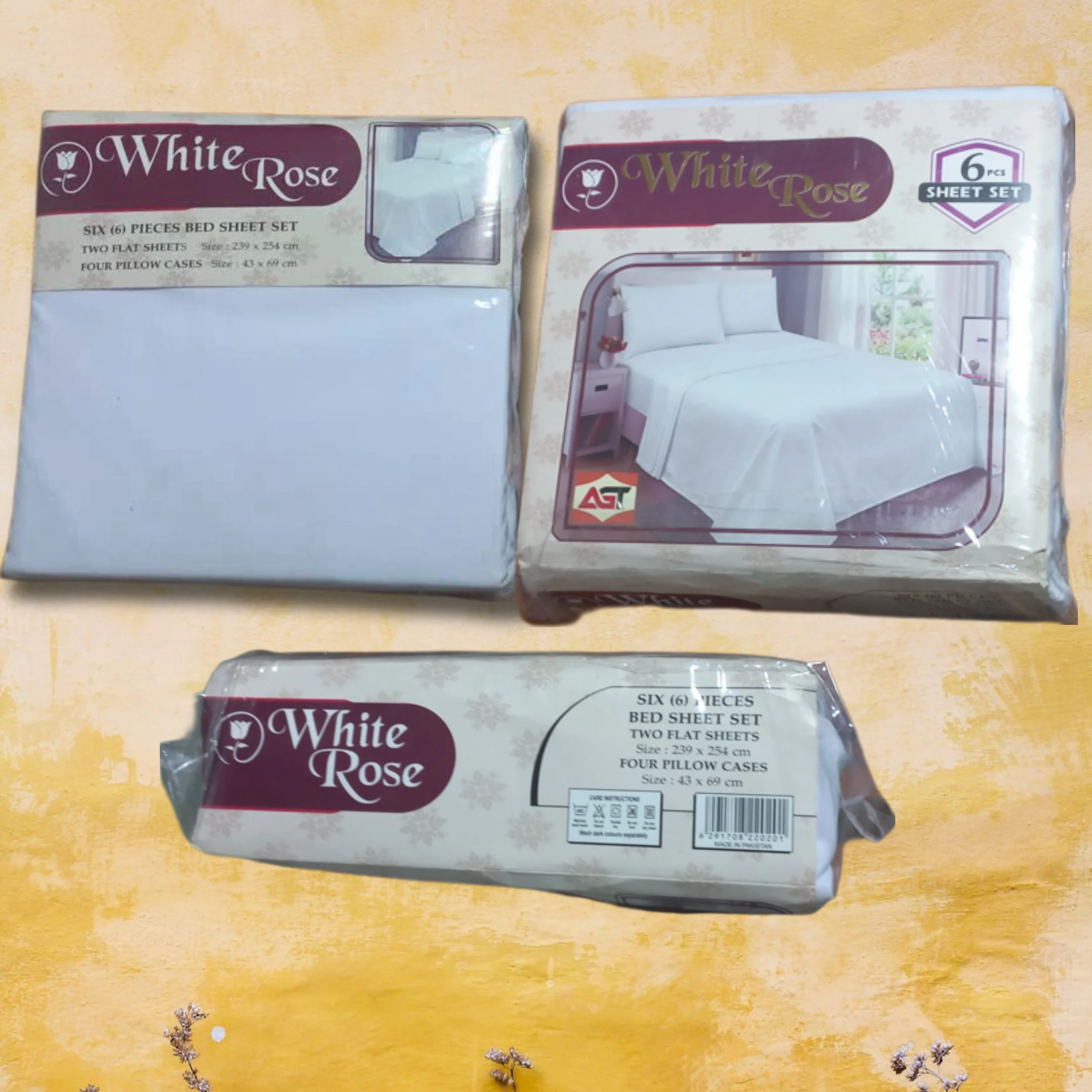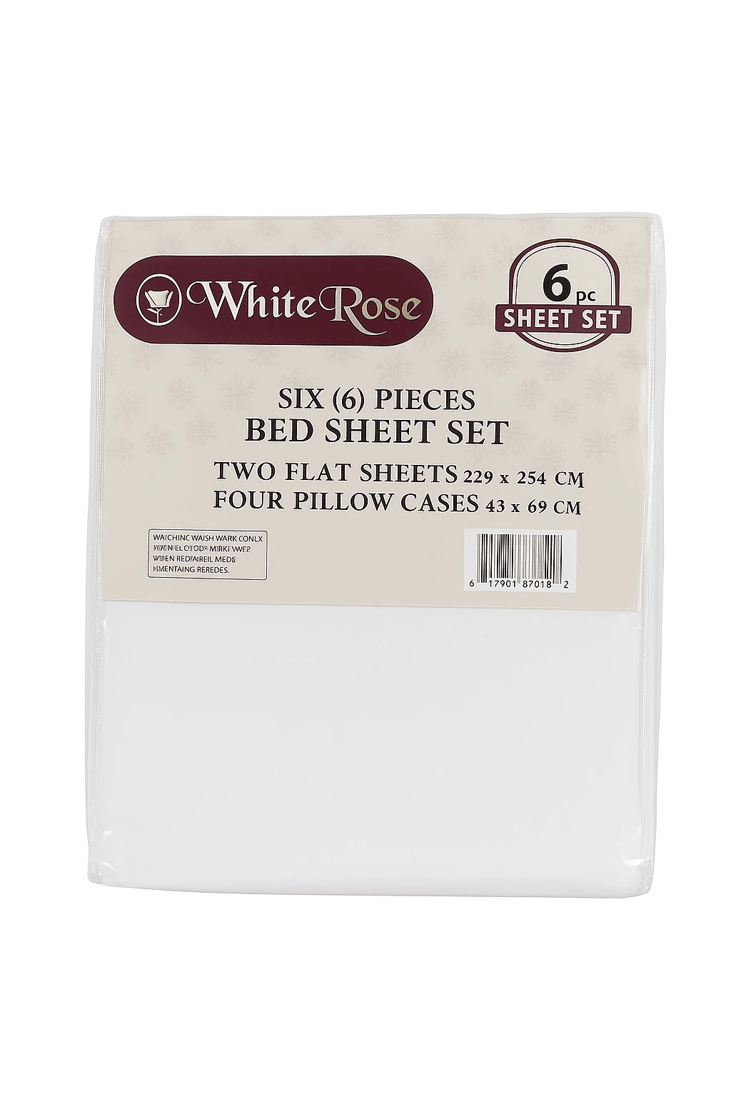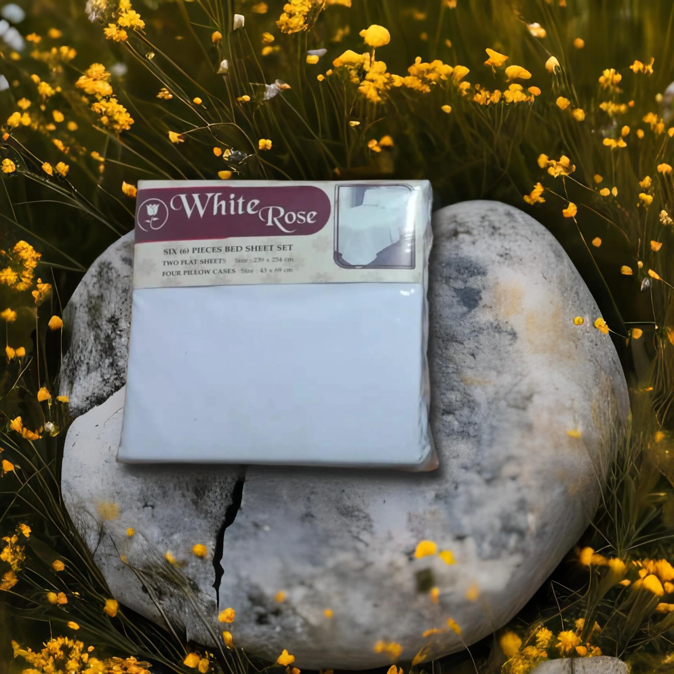 Elegant 6-piece white bedsheet set made from soft, breathable fabric. Includes 2 large flat sheets (239×254cm) and 4 pillowcases (43×69cm).