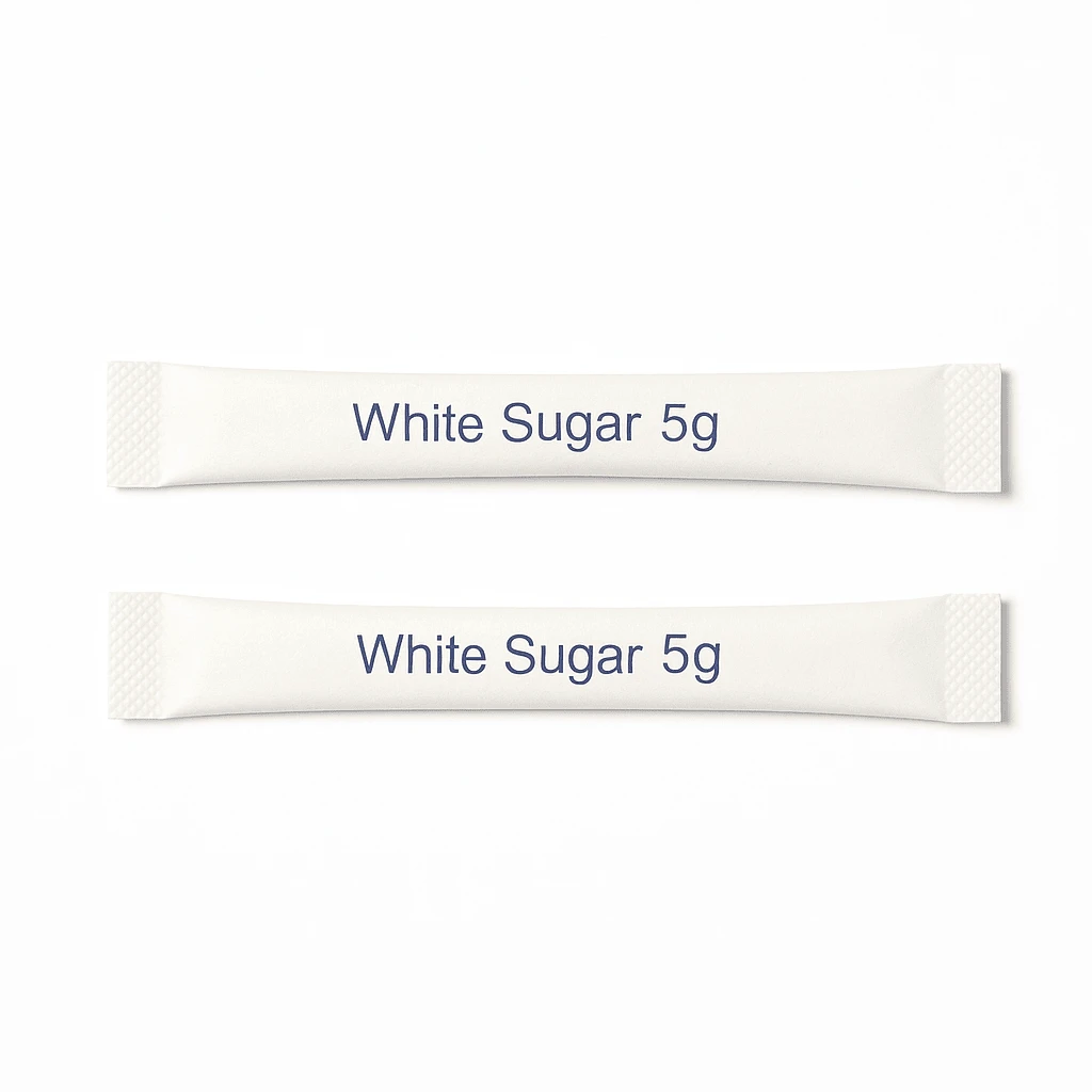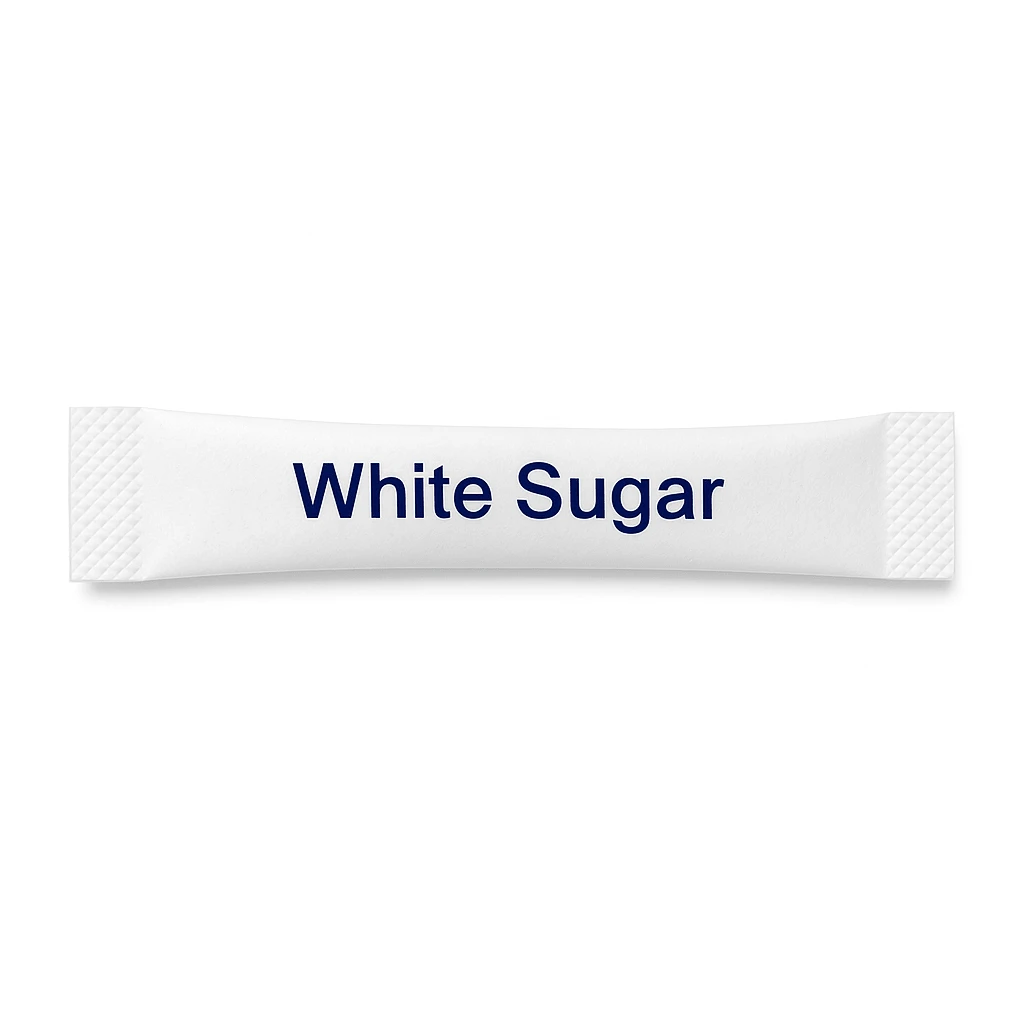 Refined white sugar sticks, 5g each, individually packed for hygienic serving in hotels, restaurants, and offices.